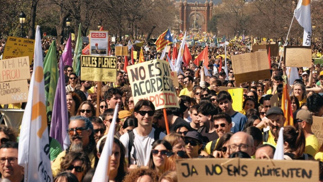 Con una movilización multitudinaria que no se recordaba desde las históricas huelgas de 1988, el profesorado catalán inició la semana de huelgas por una educación pública, gratuita y de calidad el lunes 16 de marzo en los Servicios Territoriales del Barcelonès y del Baix Llobregat. La jornada comenzó con numerosos cortes de circulación en las carreteras del área metropolitana de Barcelona, en protesta por el acuerdo de la vergüenza firmado por las burocracias sindicales de CCOO y UGT con el Govern de la Generalitat, por la falta de recursos suficientes en los centros para atender a una diversidad creciente y en protesta por los recursos públicos desviados hacia la escuela concertada y por el incumplimiento de la LEC, que obliga a destinar un 6% del PIB a la inversión en educación. También por la reducción de unas ratios actualmente por las nubes (especialmente en Bachillerato), por la disminución de una burocracia que cada día consume más horas para preparar clases y atender al alumnado y por la subida de unos salarios congelados desde hace más de quince años. Las diferentes columnas de profesores confluyeron en la Plaça Urquinaona de Barcelona, desde donde se dirigieron hacia la Plaça Sant Jaume en una movilización que podemos situar en torno a los 25.000 manifestantes.